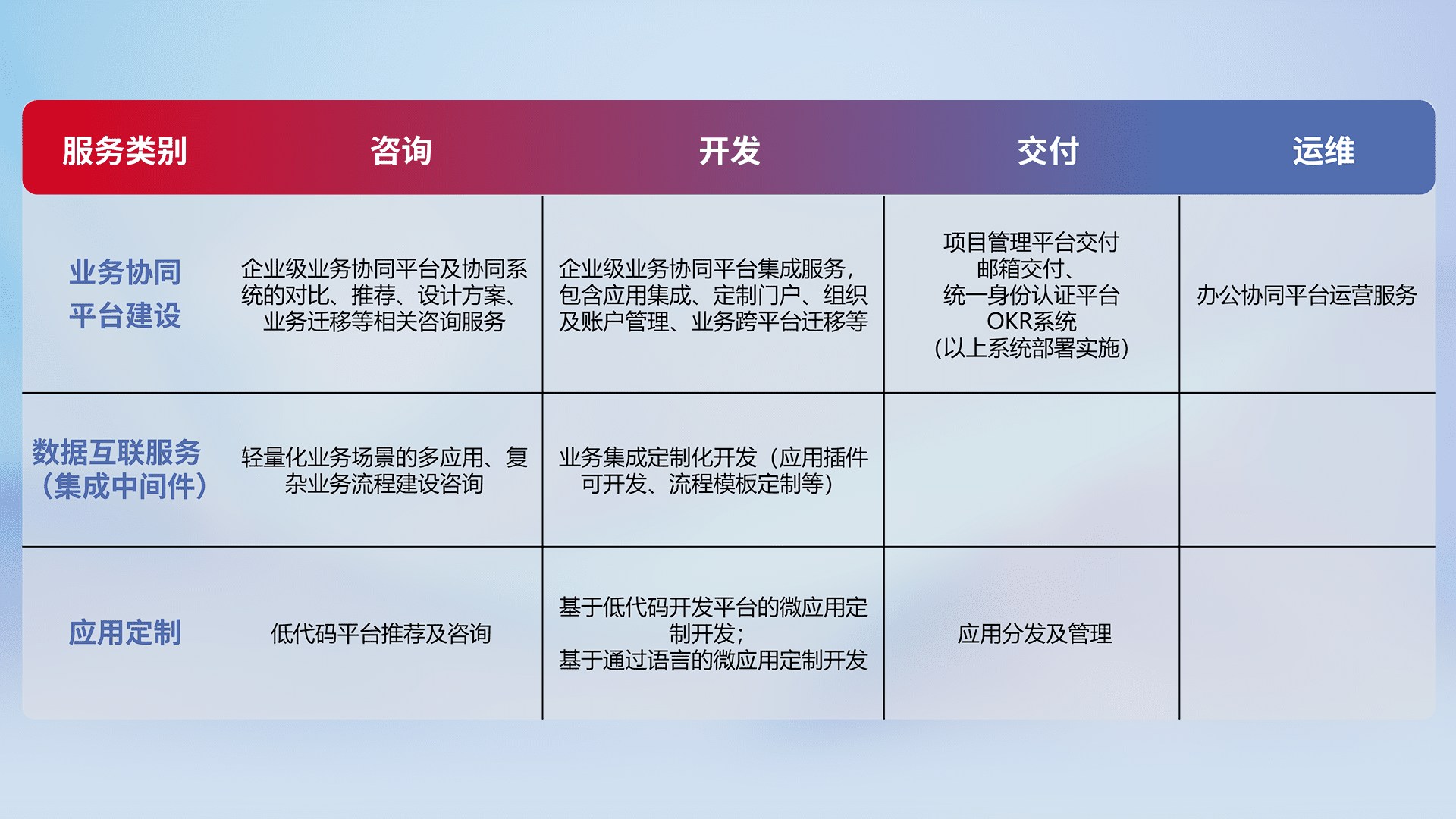 针对钉钉、、企微、、、IDaas等平台级产品提供产品的规划、、、方案、、交付、、、定制化开发等服务,,,,实现如统一协同办公、、智能客户服务、、混合会议管理、、智能数据查询、、等业务场景,,,,实现数字化转型。。。